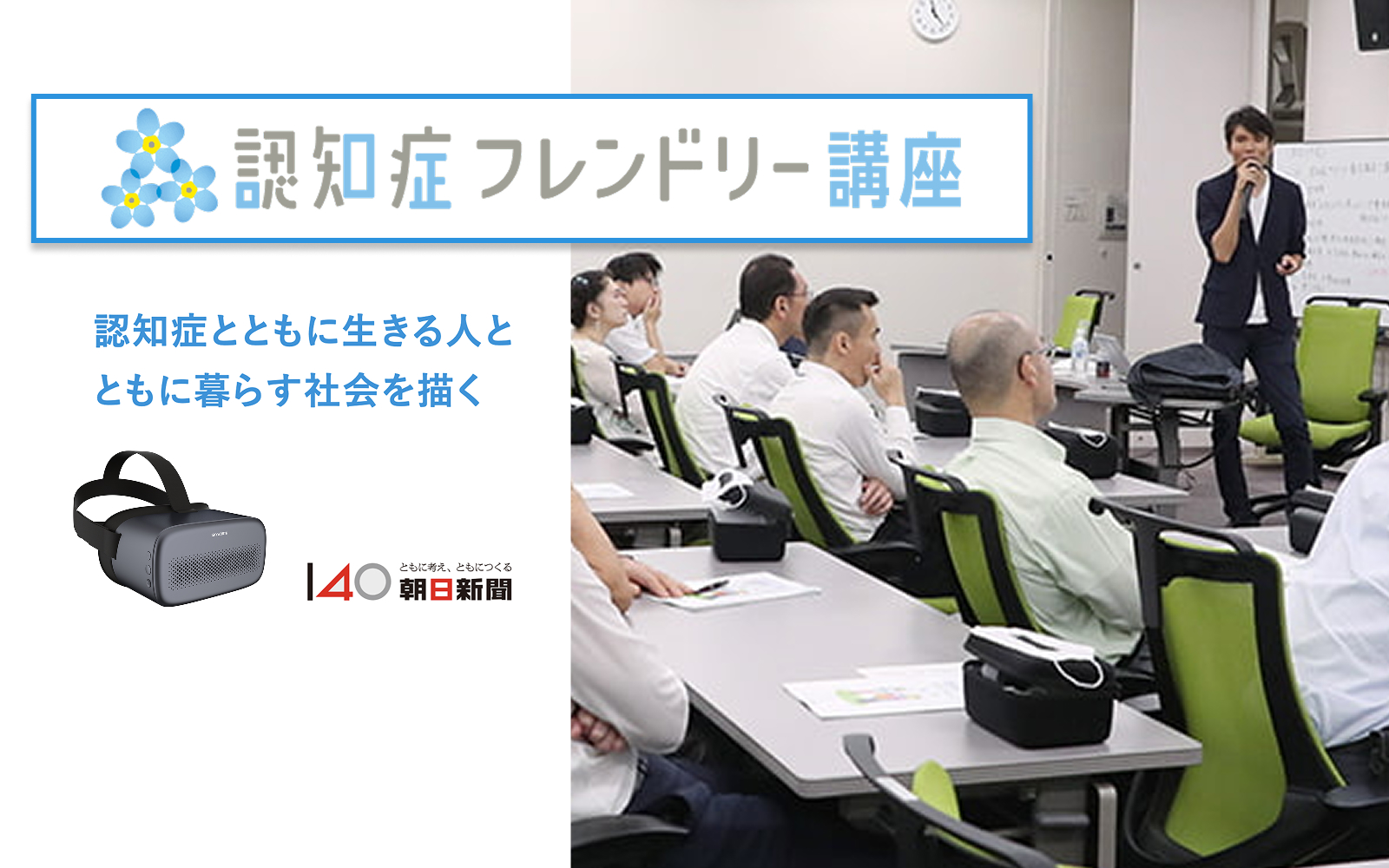 「認知症フレンドリー事業」は認知症とともに生きるご本人の思いを知り、地域でともに暮らす共生社会のあり方を考える事業として、2019年に朝日新聞社でスタートしました。認知症とともに生きるご本人のリアルな声を聞いていただき、認知症VR(バーチャルリアリティ)体験をすることによって、どのように寄り添い、向き合えばいいのかを考えてもらいます。新聞社の持つさまざまなリソースを活用しながら、「新しい認知症観」の獲得を目指し、社会全体で支え合う「社会モデル」の視点からお伝えする内容です。運営は朝日新聞グループの朝日カルチャーセンターが担っています。